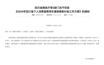 9月24日,,,,,,,,四川省商务厅等5部分印发了《2024年四川省小我私家消耗者乘用车置换更新津贴事情计划》。。。。。。该计划提到,,,,,,,,自2024年8月26日至2024年12月31日,,,,,,,,小我私家消耗者转让自己名下乘用车且在省内完成生意,,,,,,,,并在省内购置新乘用车的,,,,,,,,可申请一次性定... 9月24日,,,,,,,,四川省商务厅等5部分印发了《2024年四川省小我私家消耗者乘用车置换更新津贴事情计划》。。。。。。该计划提到,,,,,,,,自2024年8月26日至2024年12月31日,,,,,,,,小我私家消耗者转让自己名下乘用车且在省内完成生意,,,,,,,,并在省内购置新乘用车的,,,,,,,,可申请一次性定...